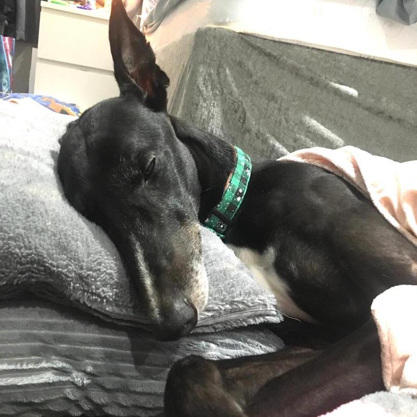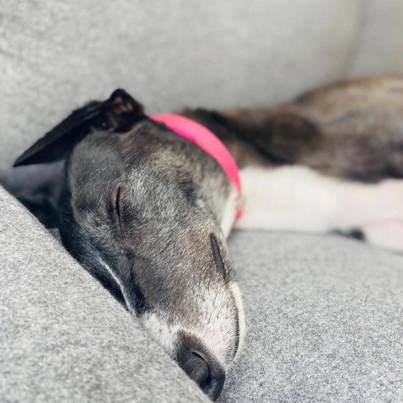 When it comes to your gorgeous grey’s new sleeping arrangements, ultimately that is entirely up to you. Some of our fosters sleep in the same room as their new humans, others do not, and this is your choice! However, one thing that we have found with every snoot is that they do appear to feel more secure when they are not alone. The reason for this is most likely because, in kennels, they usually always will have a kennel mate, so essentially they have never really slept alone before. Therefore, if you do not plan for your new greyhound to sleep in your bedroom, we suggest considering temporarily sleeping in their designated room with them for a number of nights, just while they get used to their new surroundings. For example, if you intend for your greyhound to sleep in your living-room and they appear to be very unsettled on the first night (naturally), then possibly consider sleeping on the sofa for a few nights, so that they get used to the new space but they do not panic and feel alone. This is just something that other adopters have found helped their greyhound to settle in. Regardless of where they are going to sleep, do prepare for some initial sleepless nights… You can’t blame your new grey! They have suddenly been plucked into an entirely different life and night-time whining/wandering is totally normal. Stick with it, show kindness and reassurance and they will soon settle and learn where their night-time spot is.