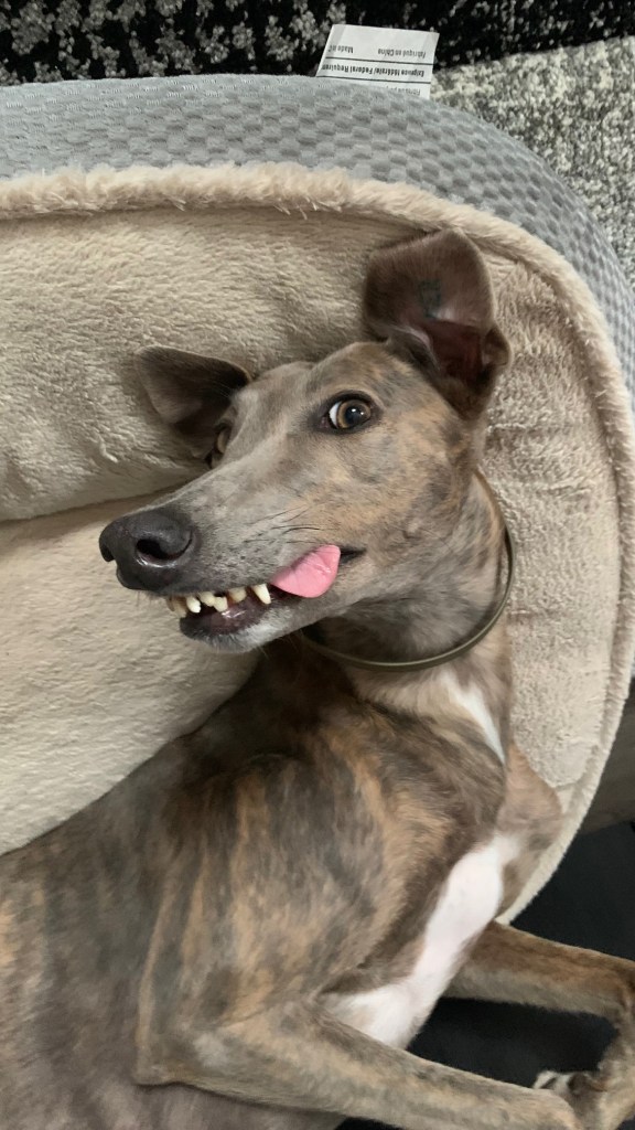 I kept an eye out on several greyhound rehoming sites and, on one particular day, I came across a dog called Diva (Pepper’s racing name). She had completely different markings from any other dog I had seen on these sites and had these demonic eyes! For some unknown reason, I was immediately attracted to her and made some enquiries about her.