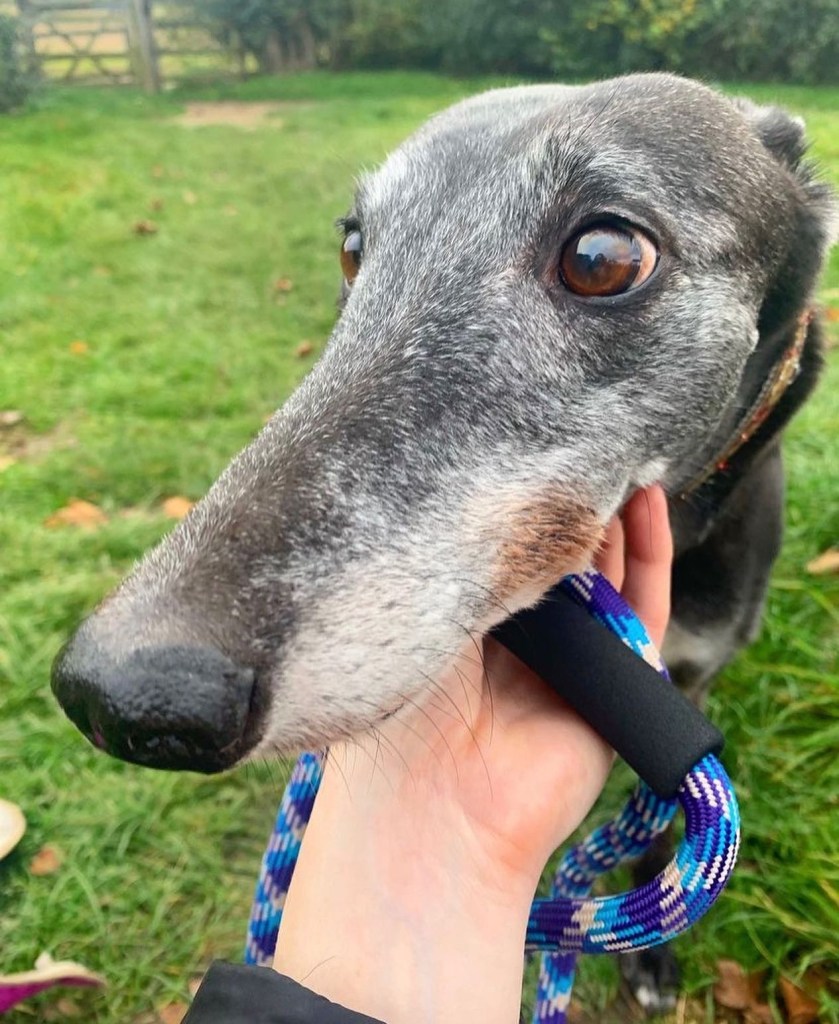 Hello, everyone! Today, I am using our platform to put out a very urgent appeal for a greyhound who is very close to my heart: Misty. I feel very lucky to say that I have walked Misty every Sunday, for the last eighteen months, as a volunteer at The Cinnamon Trust. This is a charity that helps elderly people who can no longer walk their dogs anymore. It is with a very heavy heart that I have recently discovered Misty’s owner has been admitted to hospital and can no longer take care of her; therefore, this poor girl is back in her adoption kennels, after years of experiencing a loving home, where she was very much adored.